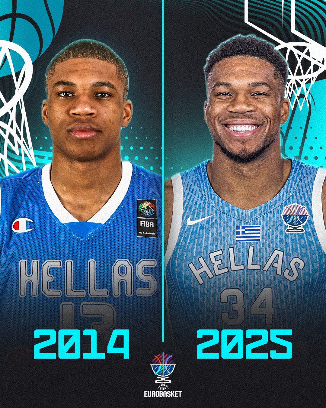 虎扑09月08日讯 欧锦赛官方更新X,晒出一张雄鹿球员扬尼斯-阿德托昆博2014年和2025年在国家队的定妆对比照与球迷分享。